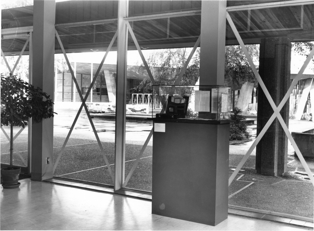 Large crosses were drawn in masking tape onto the windows of the museum for John Perreault’s Tape Event (1969). In contrast to his earlier Tape Event works, he stated that it should not be considered a performance work, as he was unable to come to Seattle to install the piece. John Latham’s Still and Chew (1966), a chewed copy of Clement Greenberg’s book taken from the library of Saint Martins School of Art, London, was displayed in a glass vitrine. -