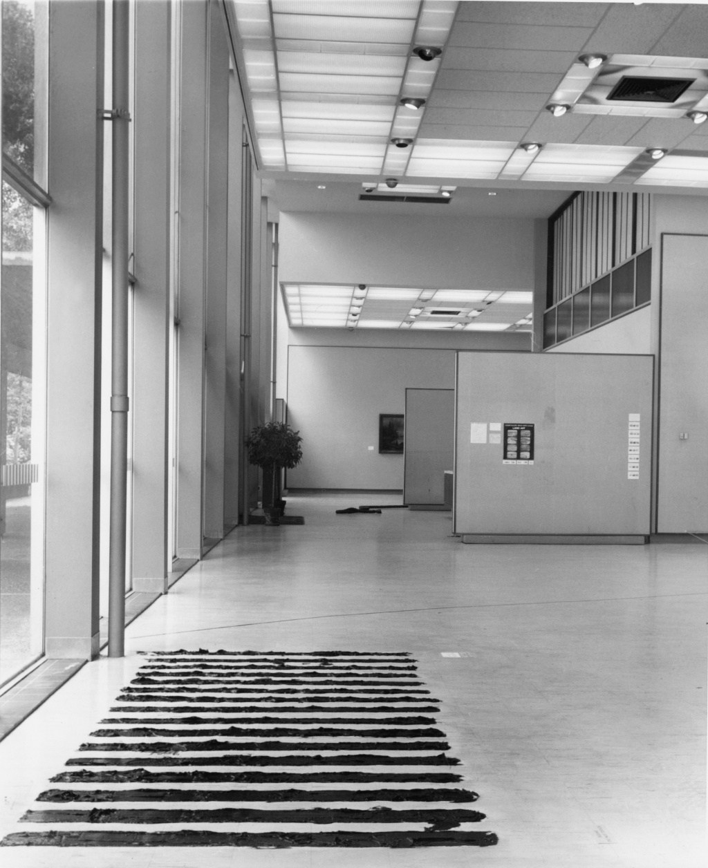 Rafael Ferrer’s work ¿Qué? (What?, 1969) was installed by Tore Haven, a gallery technician, according to a set of instructions provided by the artist that specified that nine stripes of axle grease, each 5-inches wide (12.7cm) and 5-feet long (1.524m), were to be placed on the gallery floor, 5 inches apart. The work was intended to honour an anonymous artist (in fact Haven, with the total number of stripes correlating to the number of letters making up his full name, see fig.80). On the partition wall a poster publicised the Land art film programme, originally produced by Gerry Schum for German television in 1969, and screened daily throughout the exhibition. On the floor behind the partition wall is the end of Barry Flanagan’s 15-metre long Two Space Rope Sculpture 67 (1967) . -