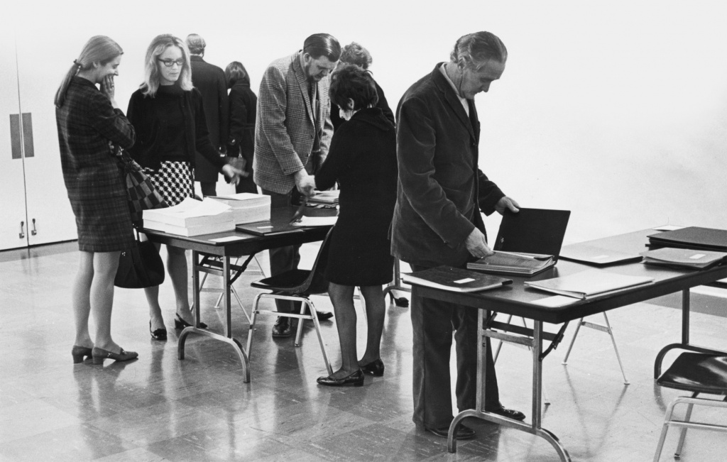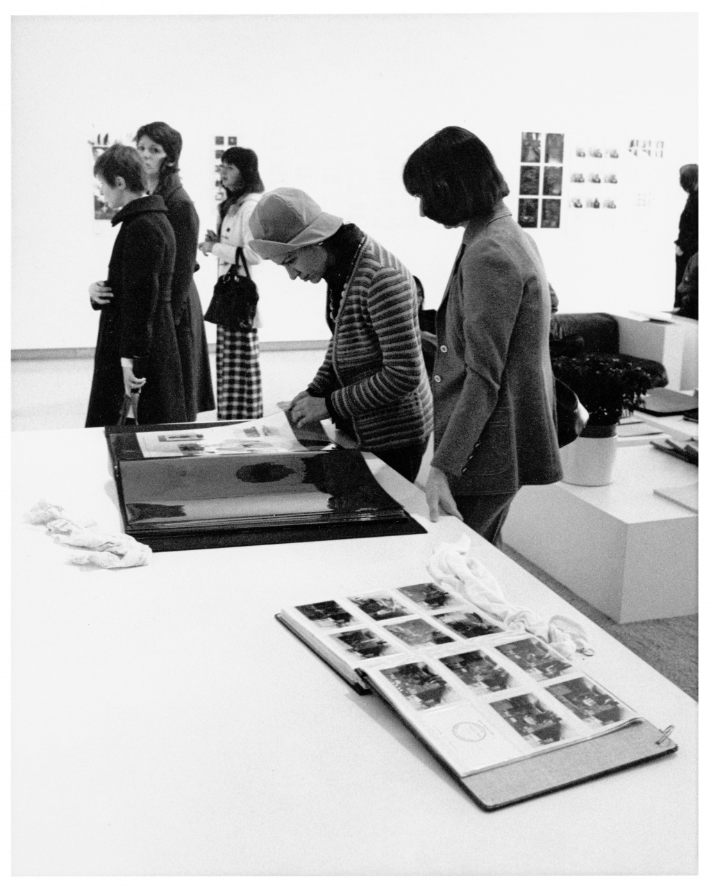 Visitors leafing through books displayed at the exhibition space, among which Hanne Darboven’s 68 (1968), consisting of six books of 366 pages each, and Donald Burgy’s two books Documentation of Selected Mental and Physical Characteristics of Donald Burgy from 1/20/69 to 1/30/69 (1969) were presented on several tables alongside other artists’ books. -