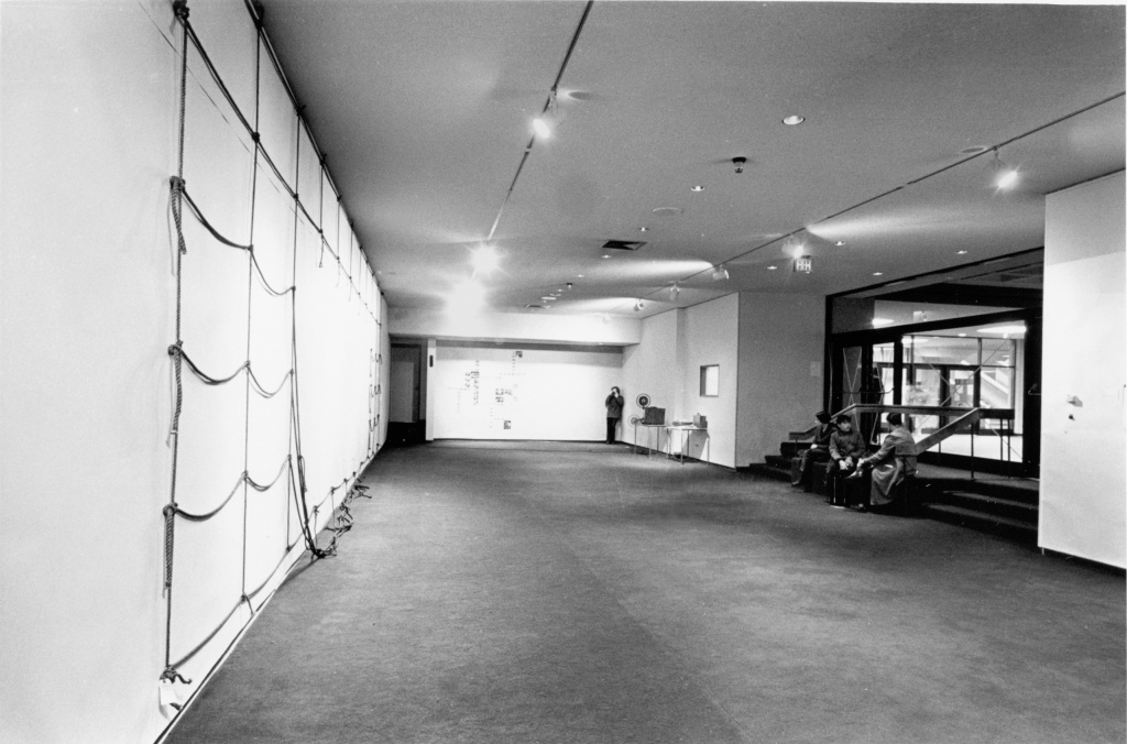 In Vancouver, some works were also installed off-site in the Student Union Building Gallery at UBC. Two films by Bruce Nauman, titled Balls and Noise (both circa 1966), were projected. Richard Artschwager’s blp (1969) is visible high on the back wall, and John Perreault’s Tape Event (1969) can be seen in the windows above the stairs. -