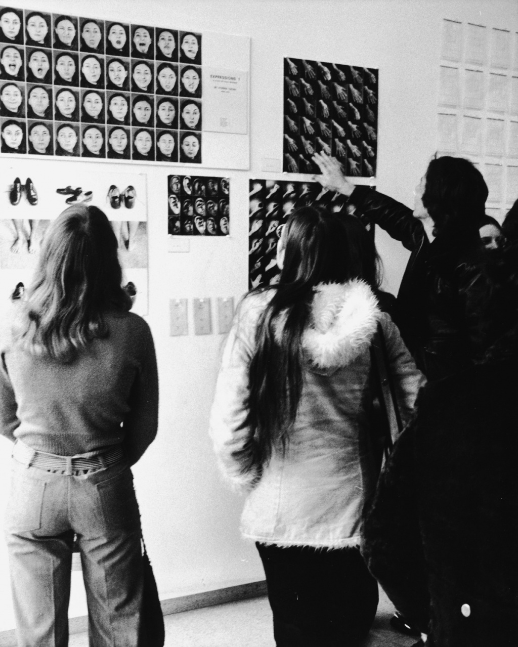Athena Tacha was represented by a series of four photographic works that document the positions she could adopt with different parts of her body. Shown here, clockwise from left, are Feet and Shoes (1970–72), Expressions I (A Study of Facial Motions) (1972), Hands (two versions) (1970–72) and Ears (1970–71). Visible to the right in the corner is 100 Identical Drawings (1969) by Nancy Wilson Kitchel. -