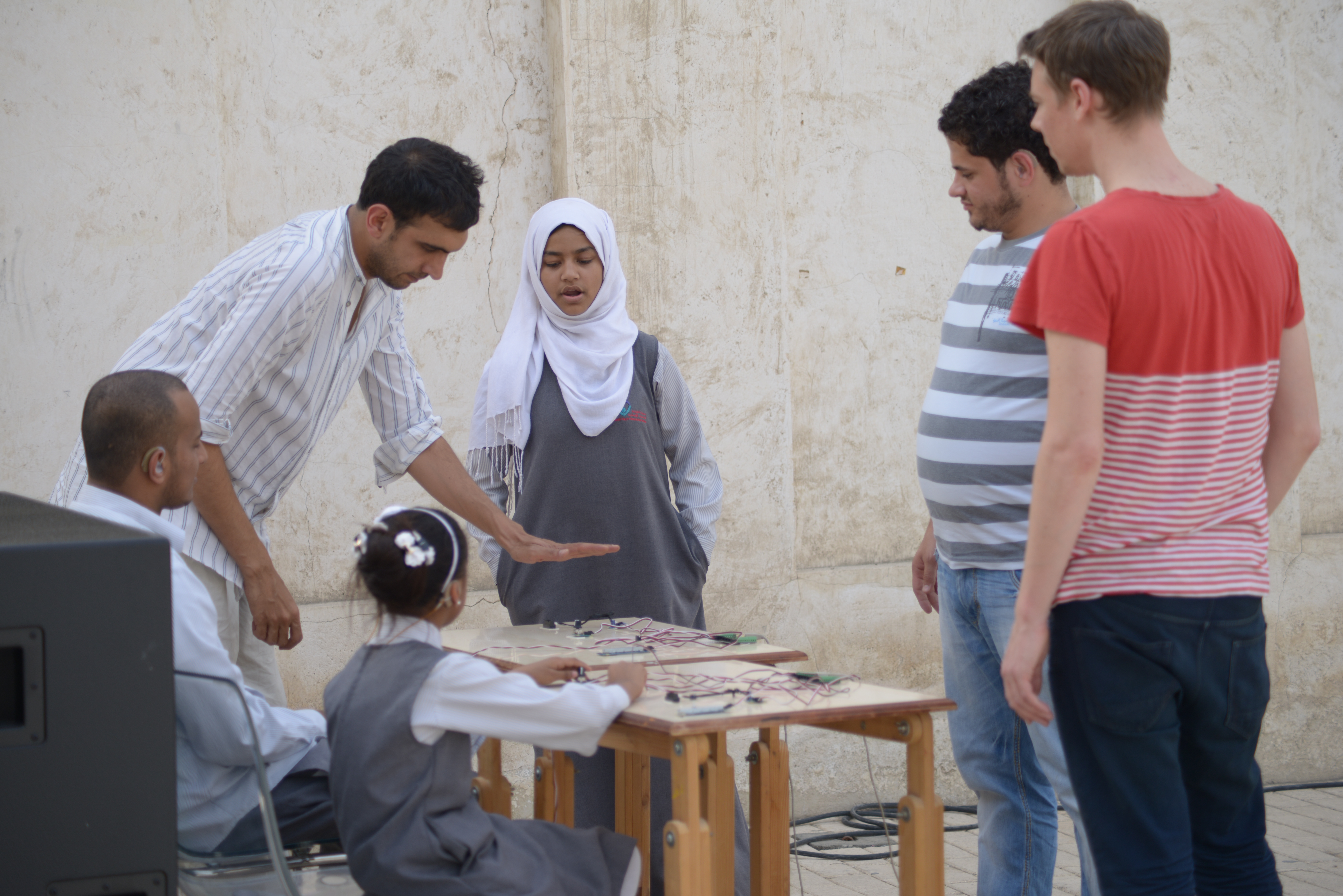 The workshop Below 160 (2011) led by Lebanese-born sound artist and electro-acoustic composer Tarek Atoui in 2012 in Sharjah began with a performance of electronic music at frequencies below 160 hertz (bass and infra-bass sounds), during which the artist asked the participants, Deaf students from Al Amal School for the Deaf, to move around the public square where the sounds could be heard and to experience them.01 Reflecting on this episode in an interview with Council, an arts organisation with whom Atoui collaborated on the many chapters of his work with d/Deaf people, he recalled: ‘20 minutes into the performance, several students came on stage wanting to join and play with me. It was a meaningful moment in which the conventional distinctions between audience, stage, space, and musician collapsed. […] After this experience, Below 160 was transformed, and I left Sharjah with the will to return and keep on learning from the Al Amal school.’02 In this piece, Atoui sought to use sound as vibration with the intention of establishing a connection between his body and those of listeners. Although Atoui had performed the same piece to a hearing audience once before in Salzburg, as he recounts above, the desired effect and ensuing conversation with listeners became compelling only when he played it before a d/Deaf audience who expanded the realm of possibility of his sound performance.03 Below 160 represents an instance in which this new audience changed the artist’s understanding of how sounds could be performed and experienced. Atoui began his longstanding work with d/Deaf persons during a residency at the Sharjah Art Foundation in 2012. The first encounters, as he explained to me in a conversation over Zoom this past summer, ‘very much relied on where I come from, as somebody who makes electronic or noise music, [using] heavy or low-end frequencies. What took shape was a workshop that relied on using a lot of subwoofers, a lot of bass frequencies [while] trying to associate them with objects, with colours, with impressions and perceptions that d/Deaf people mobilise, [so for me] it was about understanding how they perceive these sounds as vibrations, as emotions, sometimes as movements […] the first encounter showed me how much there was to explore, starting with vibration, with immediate sound.’04