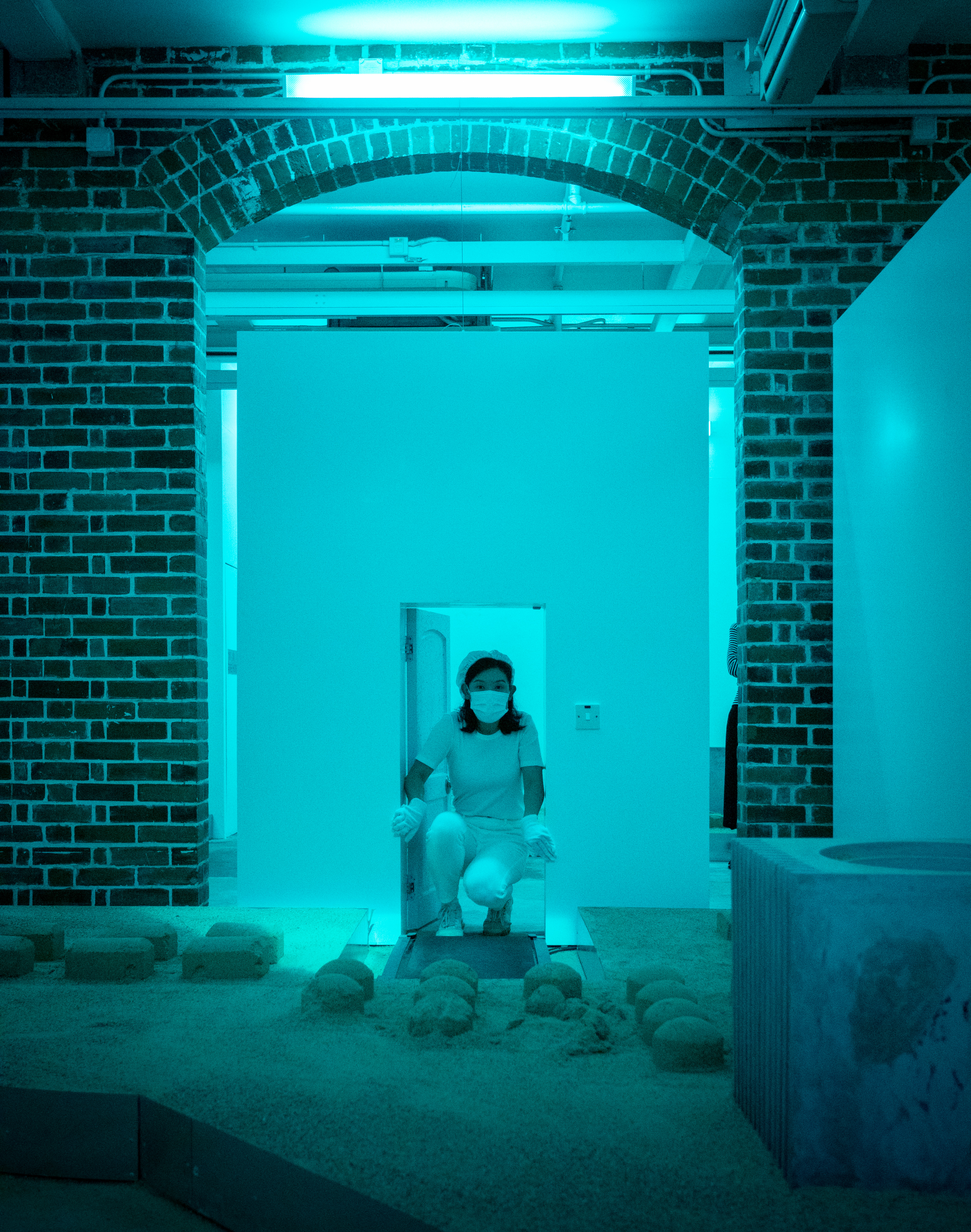 These include the mixed media installation, Ventriloquists’ Stone (幻石) (2023) by Nadim Abbas whose show at Oi! spanned several rooms of the historic art space.03 Even before entering the exhibition site, visitors came across several sculptural components – a freestanding, arched wall with an inset speaker, along with several stone cubes lying outside on the building grounds. These same elements were echoed inside where brick walls with semicircular openings evoked cavern-like grottos, along with more of the same stone cubes and mounds of sand in repeated pattern configurations on the floor. The entire scene, steeped in blue light and enlivened by background noise, also included monitors with simulcast views of different parts of the installation and a band of performers donning white caps, masks, and gloves as uniforms, walking in and out of truncated doors and running on treadmills scattered throughout the site.