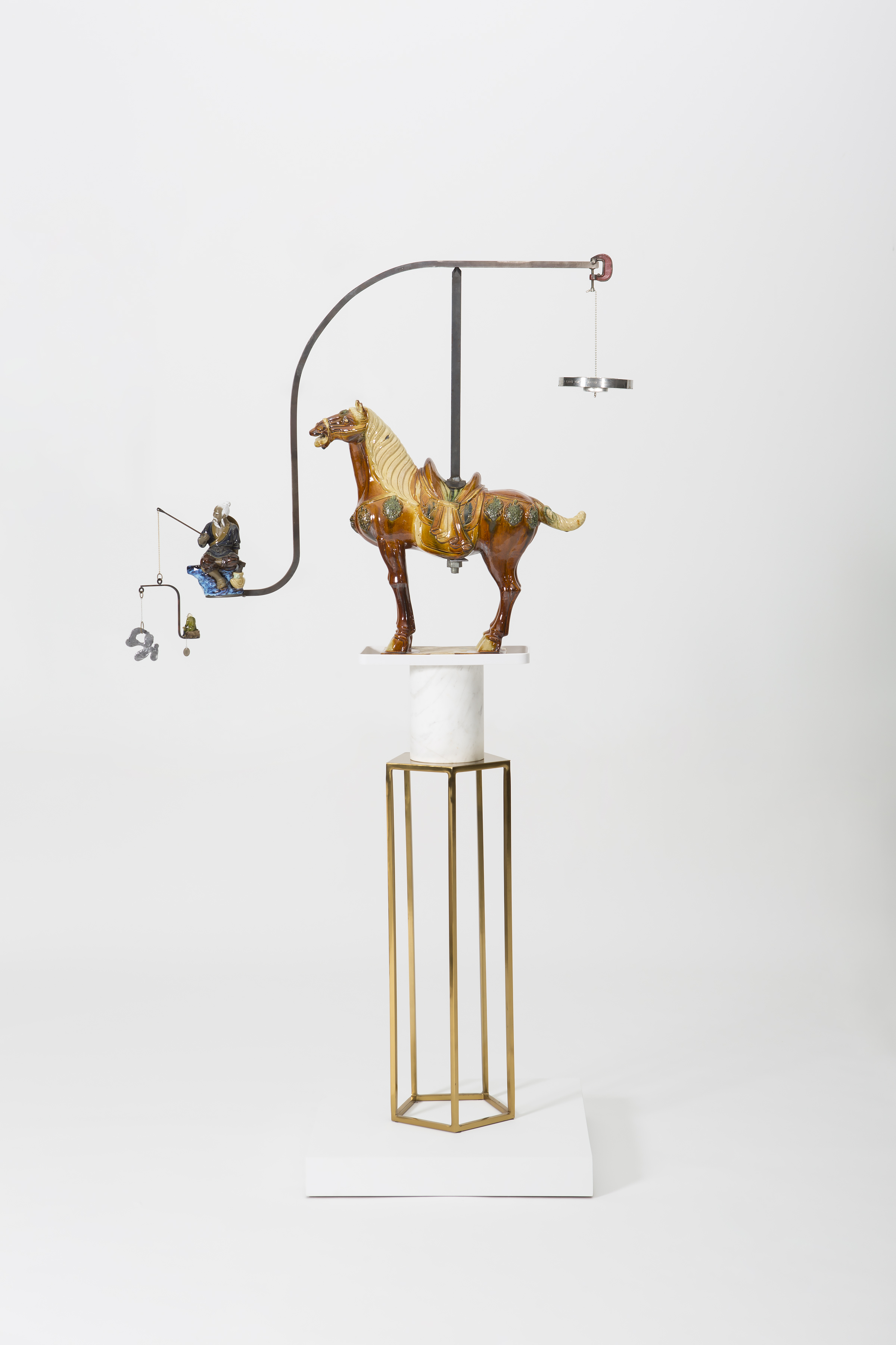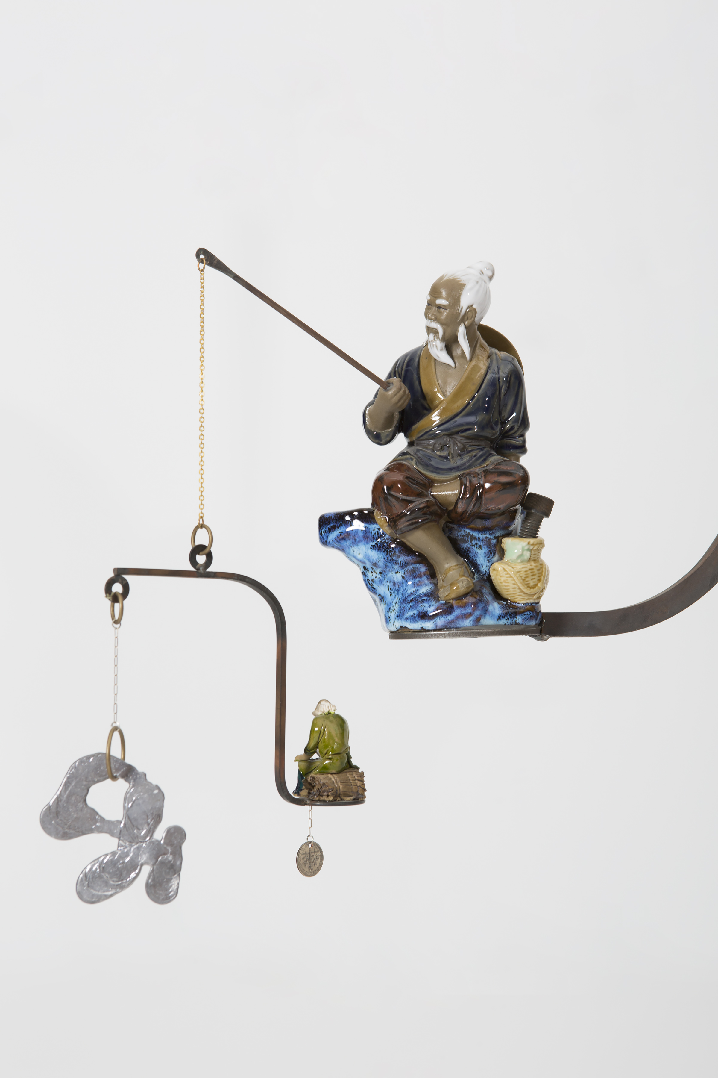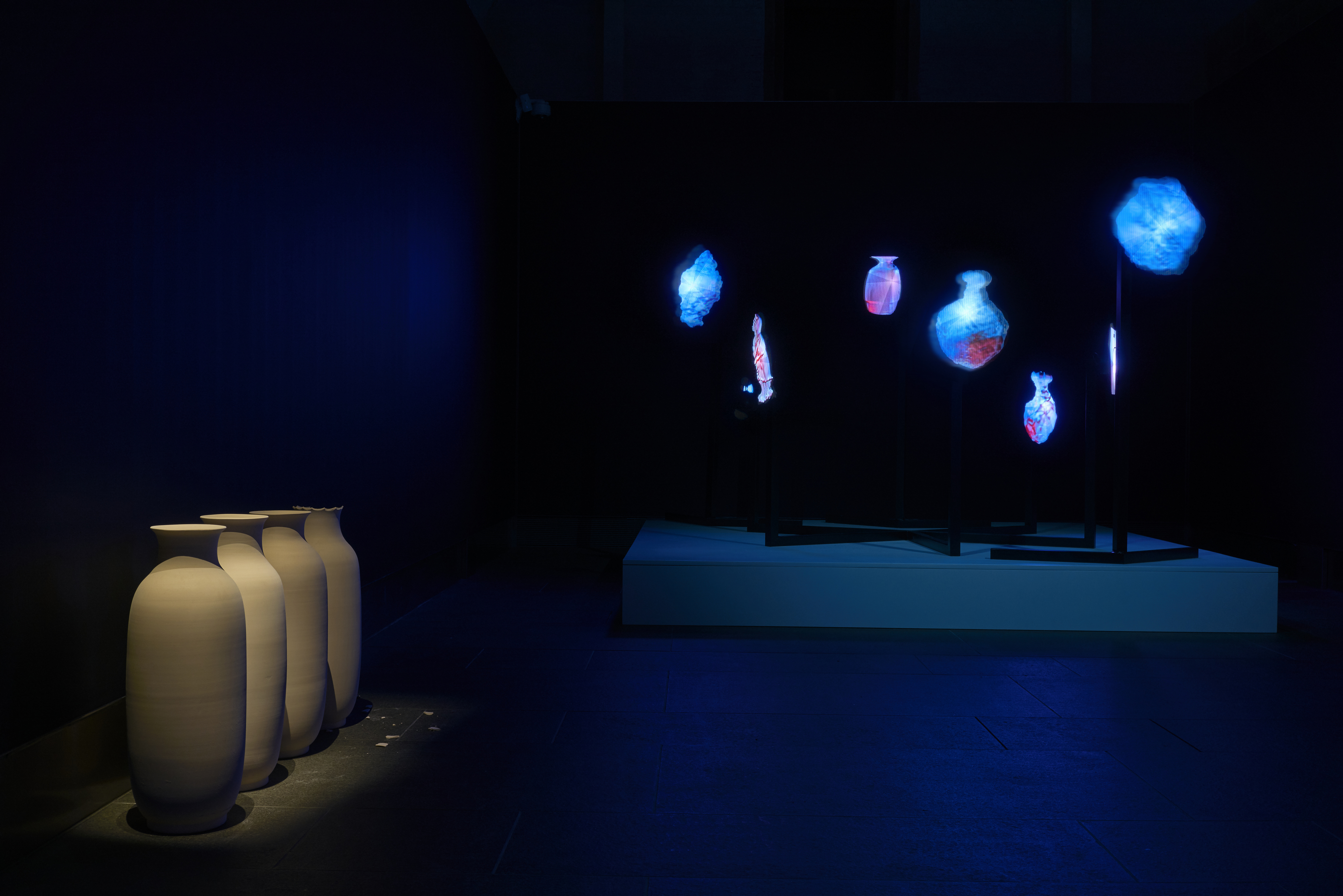 The ability to create a sense of place is in part embedded within the history of the place itself, as Hong Kong duo Zheng Mahler, comprising artist Royce Ng and anthropologist Daisy Bisenieks exemplify. Teetering between past, present and future, their works combine low-cost material goods, pseudo-heritage artefacts and seemingly immaterial technologies. For instance, in The Master Algorithm (2019) cheap fans are used to present holographic imagery, while in the installation Mountains of Gold and Silver are not as Good as Mountains of Blue and Green (2020) Asian ceramic objects like vases and plates serve as shorthand for cultural heritage, and their surrogates.