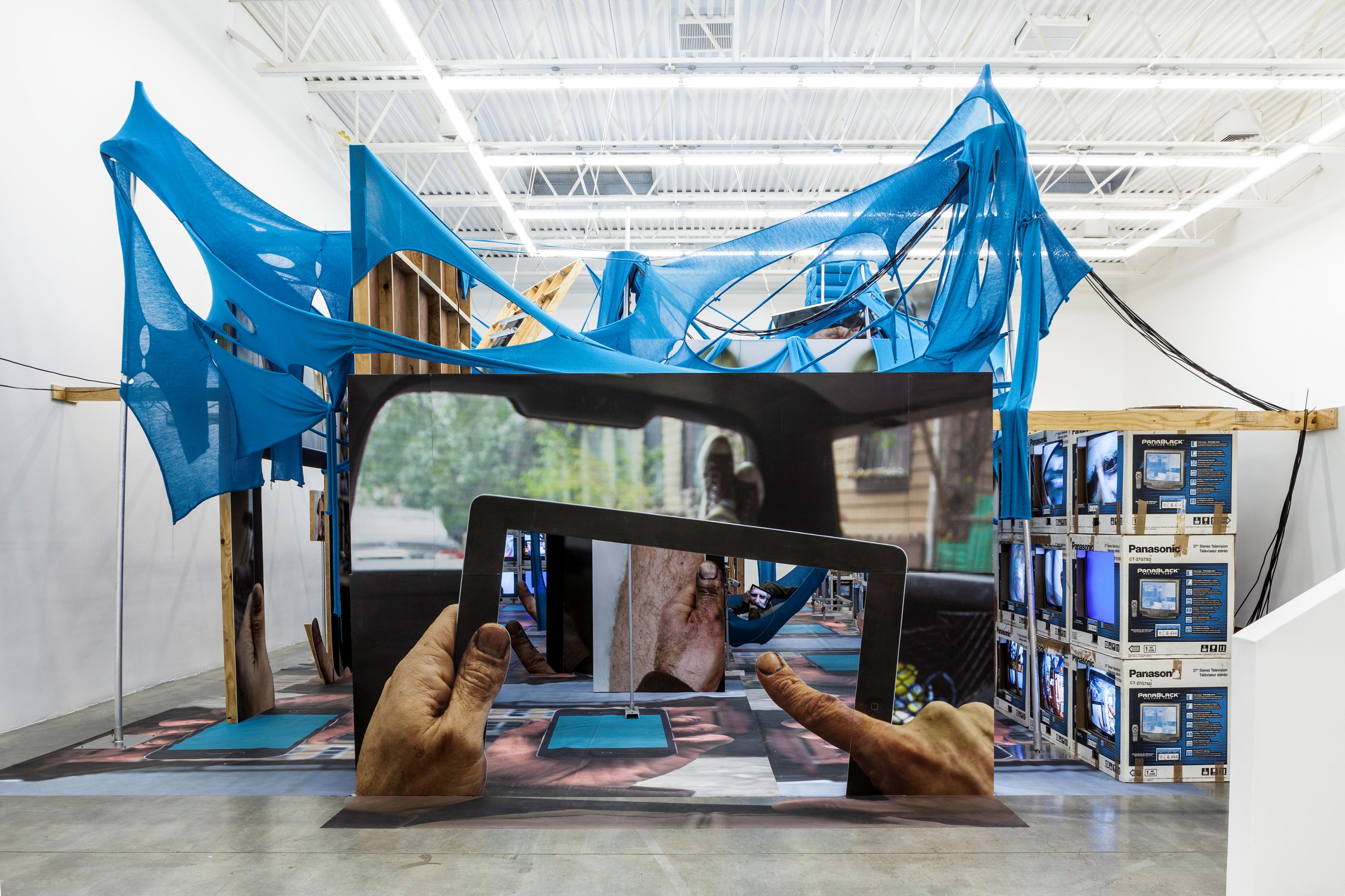 Much like the Internet itself, The Web acts as both a sentient organism and an environmental space: it facilitates the internal circuit between viewer, camera, and monitor, while simultaneously doubling as a sprawling architectural structure. While The Web conceptually foregrounds the role of networked technologies and our dependence on them, it is in many ways a tribute to direct experience. The viewer of The Web is repositioned among fellow viewers, with the feeling of sensory dislocation condensed into one geographic location – the exhibition space – and recast as a form of shared collective immersion.18