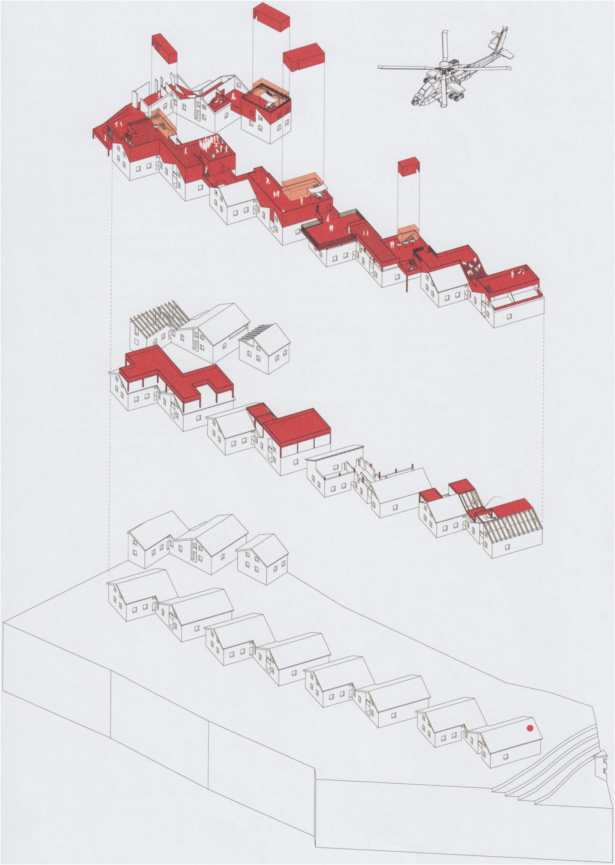 There are hundreds of thousands of Israeli-built structures within more than 200 colonies and military bases in the West Bank, but because the number of typologies in settlements is limited – variations on the single or double-family dwelling – these ‘fragments of possibility’ constitute a general approach that could be modified to be applied in other evacuated areas. The architectural approach creates an image of transformation that because it is applied on the small scale of the house opens up the possibility of transformations within a much larger field.