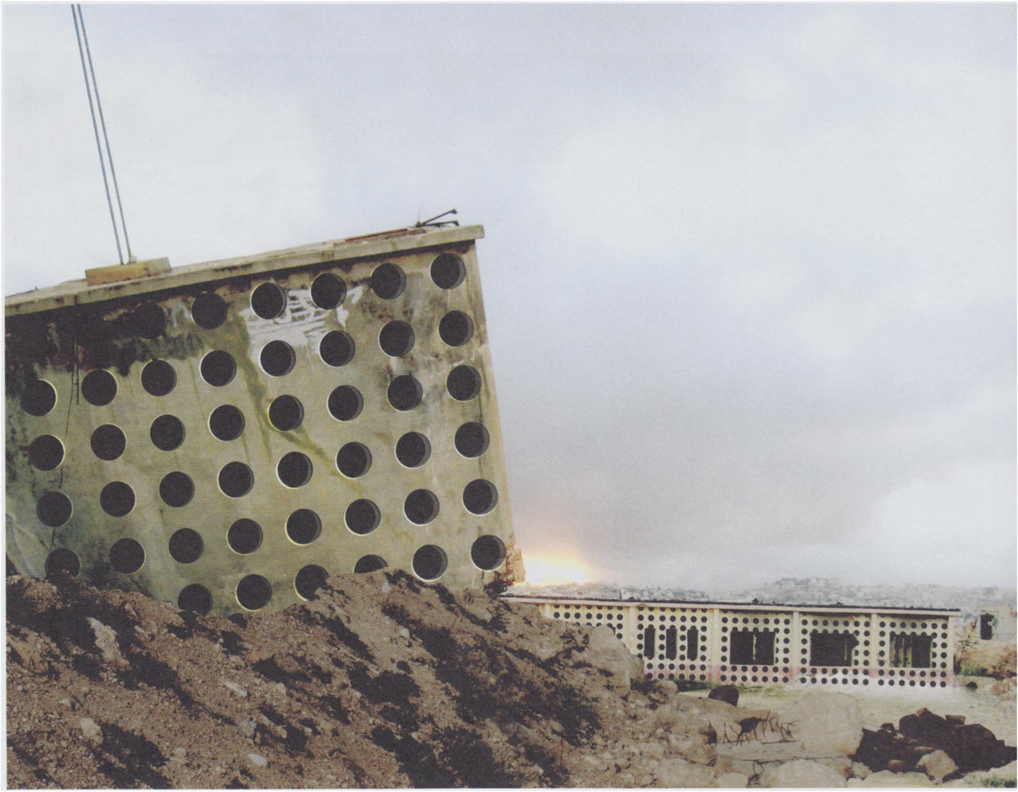An opportunity to implement our approach in a situation when some of the infrastructure of occupation has been evacuated came earlier than expected. In May 2006, the Israeli army evacuated a military camp strategically located on the highest hill at the southern entrance to the Palestinian city of Beit Sahour, in the Bethlehem region. It was a menacing fortress overlooking the edge of the town. Most houses surrounding the camp were destroyed by tank shells and gunfire originating at the base. Flood-lit during the night, flash lights constantly scanning the area around it, the base was caught in an ‘endless day’. The evacuation was itself a violent operation: at night dozens of tanks rolled into the town and in the morning the base was found empty. Moments later, Palestinians entered the base and took away every element and material that could be recycled.