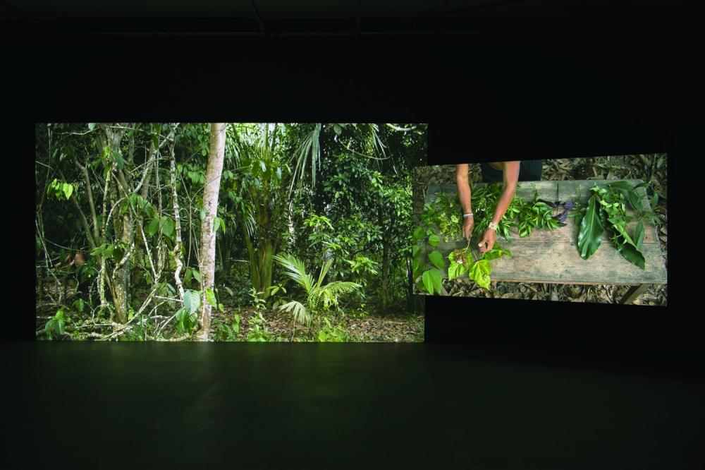 Forest Law (2014), a 38-minute video projection by Ursula Biemann and Paulo Tavares shot from two different perspectives, considers similar themes of the forest’s occupation. The video contends with the inability of human representation to address the world of the forest, reflecting on the failures of institutions to represent nature in general. In the history of the Americas, the law has served as a blunt tool for forest protection, as it has often instead been weaponised in the interests of national elites as well as local and global capital. The violent terrain of occupation enters the frame differently in Forest Law when compared with Huichaqueo’s work. Although Forest Law is quieter, the cacophony of occupation is omnipresent. We are shown instruments of measurement, management and cataloguing, and hear from scientists who understand the forest as an endless source of knowledge, genetic and medicinal production. In the layers of lush forest life, we see how the scars of oil drilling diminish the capacity of Eastern Amazonian biodiversity. Extractivism is present both inside and outside of the frame, yet it is not the main subject. Instead, the central figure is the living forest and its interactions with humans like the narrator Franco Viteri, who describes his rich life in Sarayaku, made possible through a sustained relationship with the local habitat.