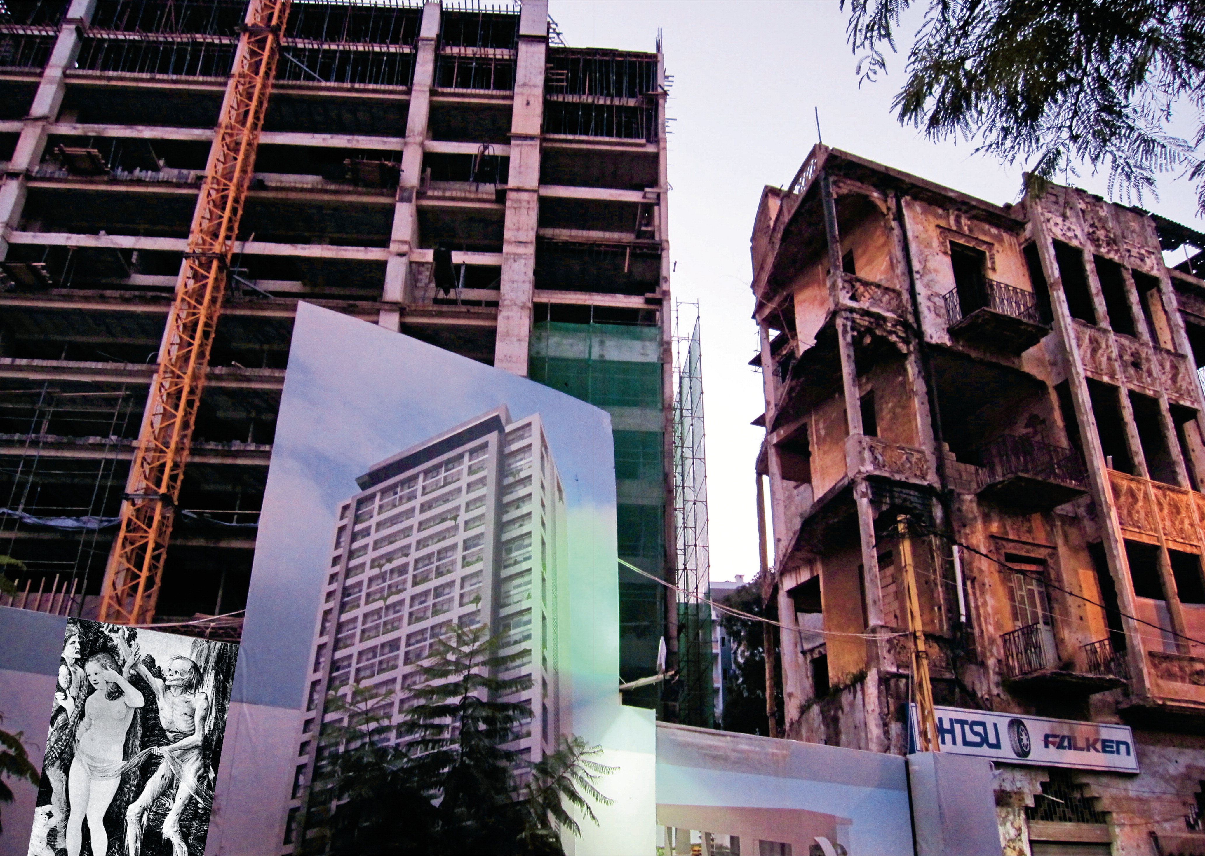 In Beirut, I walk — either to make sense of the city or as exercise; they say it’s good for the back. But even then, the past-in-the-present can strike you at any moment. While walking through Rue de Damas, I saw a massive building being constructed, right behind the Greek Melkite Archdiocese; since it’s still under construction, the plot is surrounded by a tall metal fence, on which the construction company hangs promotional posters of what the building will ultimately look like and how good it will be to live there. One of the posters shows in large perspective the building in its finished state. On the plot adjacent to the construction site, there’s an old house with visible traces from the battles that took place there during the Lebanese wars. For some reason the house has not been torn down or restored, and it looks abandoned. And so, we have a building from the present, under construction, a building from the future, in the form of a promotional poster, and a building ravaged by past wars; or maybe, the skeleton of the building under construction is the future of the building in the poster, now abandoned and ruined; or maybe, the war-torn building is the future of both buildings next to it, and not their past — which is not a far-fetched delusion in the current state of political turmoil dominating Lebanon and the region. This whole urban image acts like a vanitas, or a memento mori; death is telling us: ‘I am here, even here, in this fake plastic paradise you’re trying to construct over the crumbled dust of these bodies.’